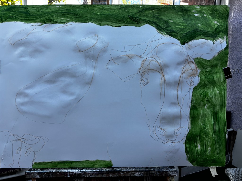 The subject of my painting though was safely on the other side of a barbed wire fence so I was able to take a photo without personal jeopardy and when I find it again, I’ll post it here. For compositional purposes, I took two cows and a clutter of legs out of the image and made a rough sketch on A1 cartridge.