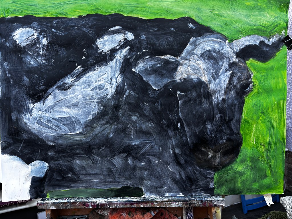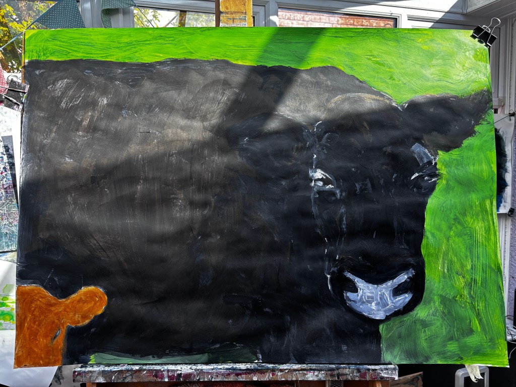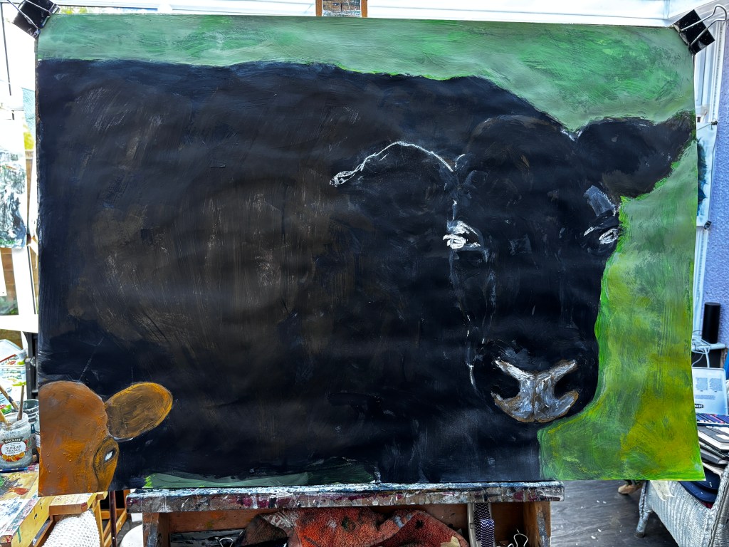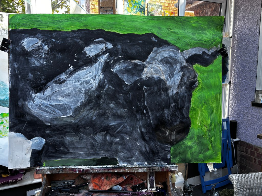 I’ve definitely found drawing into a painting with soft pastel or just plain charcoal helps me find and expose lines. This cow is kinda looking straight at me but simultaneously looking slightly to one side. Her eyes are sideways on too, and at a slight tilt, so marking those shapes out helped me get a feel of the whole. Painting them in subsequently was easier although that mouth and the angle of the eyes has given me (is still giving me) huge problems.