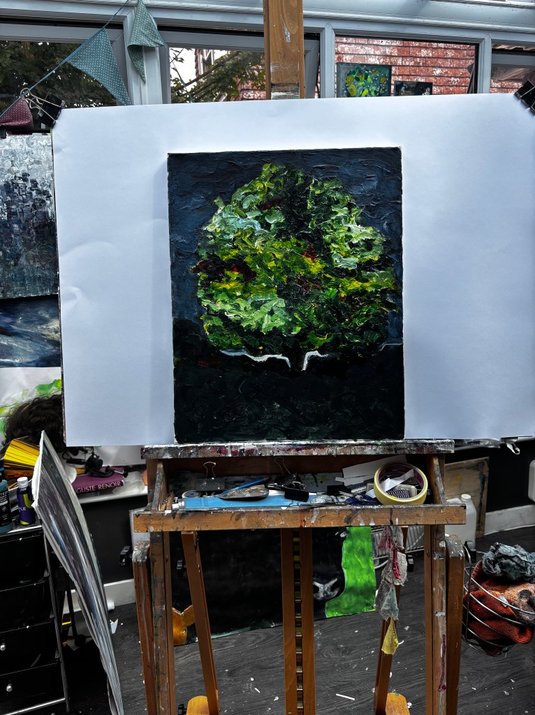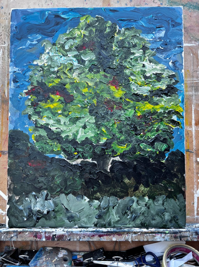 So it’s moved on a bit. I want the sky to be darker, more foreboding, and the foliage is still quite raw and flat, even though in reality it’s anything but with all that paint loaded onto it! I think the light is flattening it too, along with the camera because it really doesn’t look flat to me.