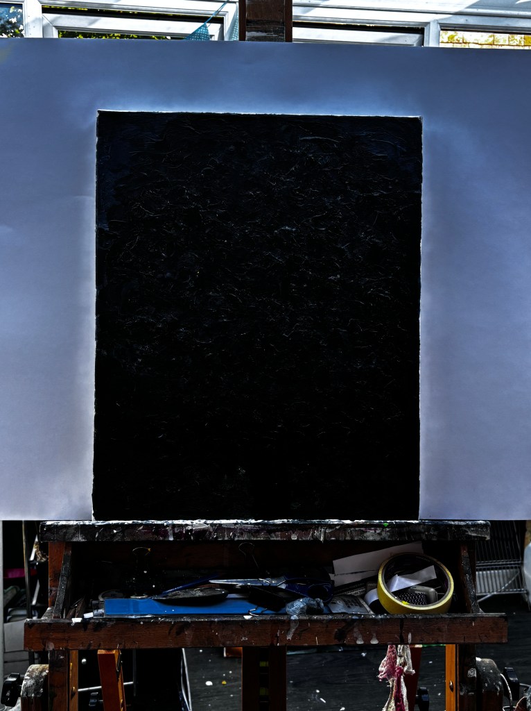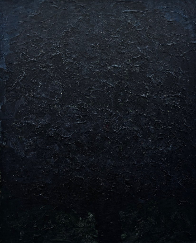 The choice of colour is not about despair, it’s about the universe, its components largely hidden from us but there nevertheless. The tree can be picked out only by light catching on folds and bumps on its surface or by feeling the whole surface of the canvas. Its story is its meaning as an exchanger of gases; habitat and shade for a multitude of organisms; and for us uniquely, a source of fuel and constructed shelter.