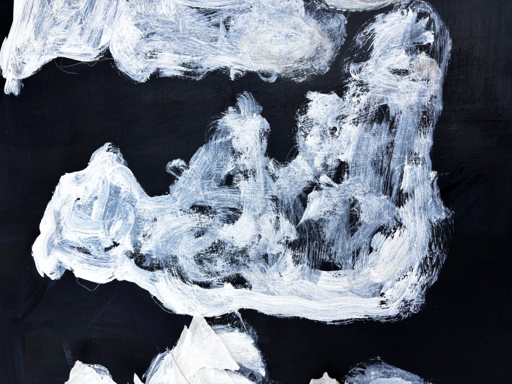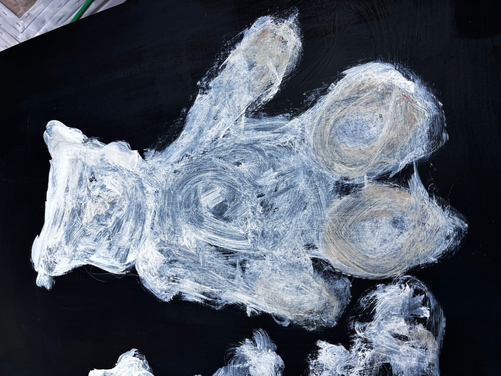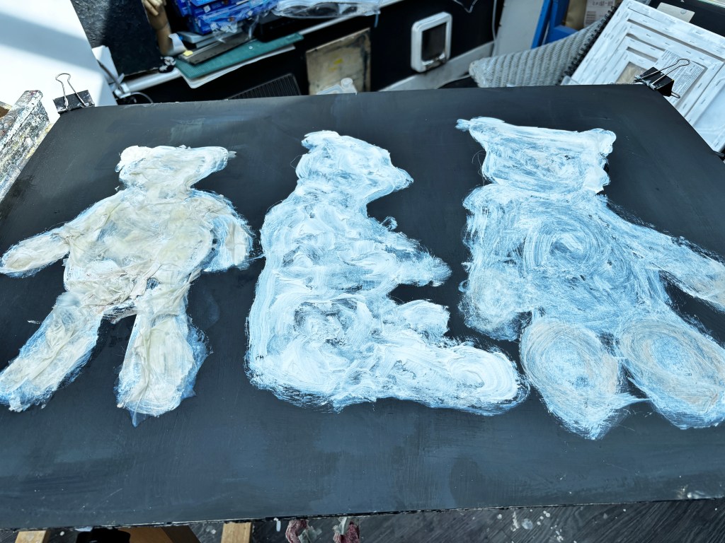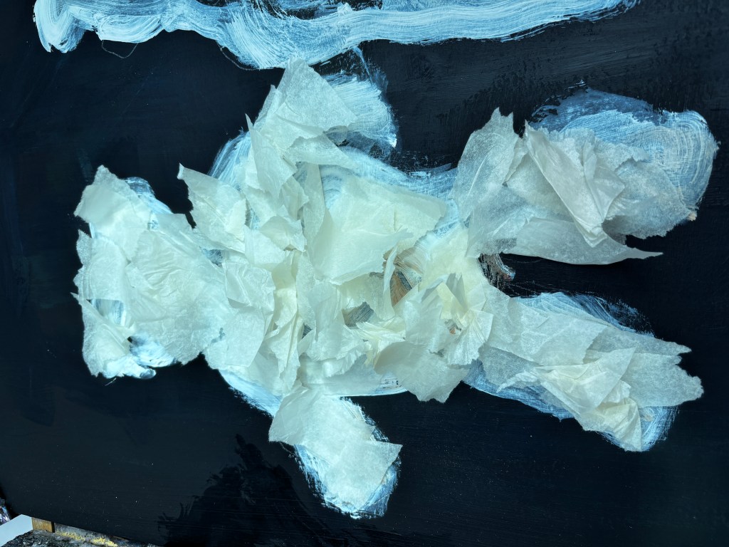 I drew out three bears in watercolour pencil on black card, varnished them within their outlines, then enlarged them with a flat brush and white acrylic. I added tissue to the first one and set it with varnish.