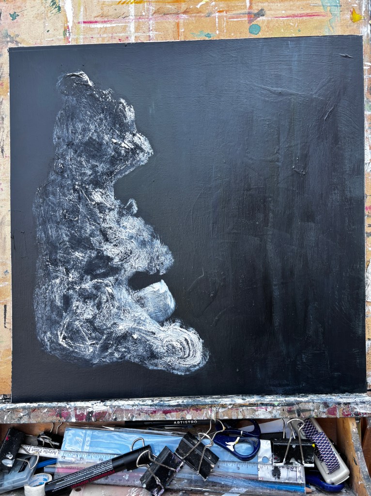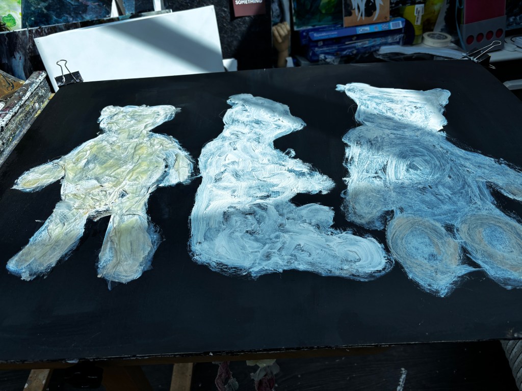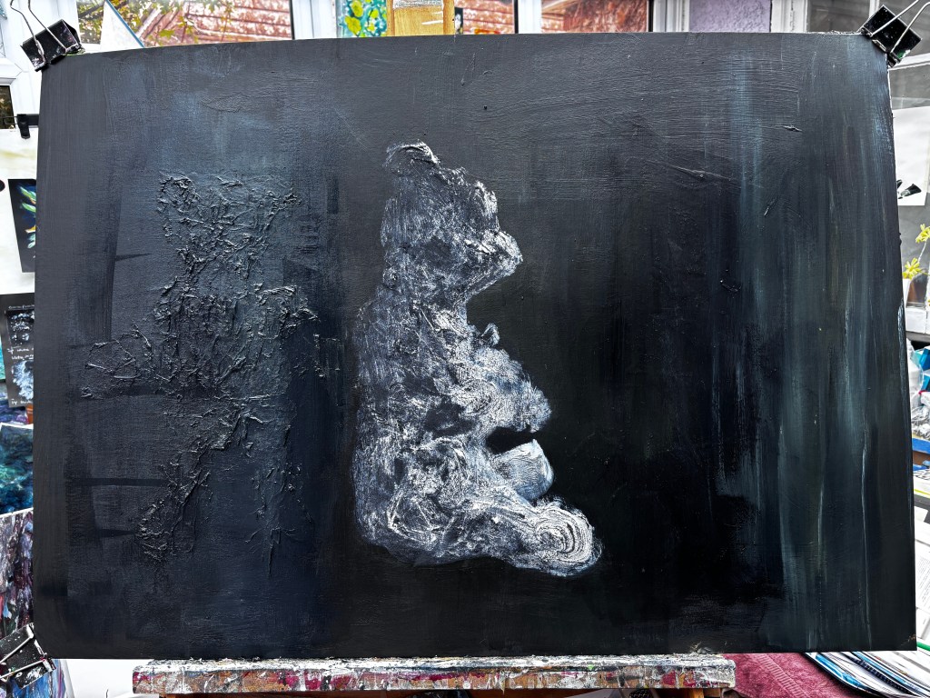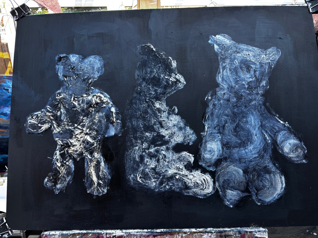 The next step was to pull out texture by lightly brushing black acrylic across the surface of each. Middle bear comes off best in this exercise and I think my next step will be to add a tiny bit of highlight – like a spotlight – to him while washing the other two into the background.