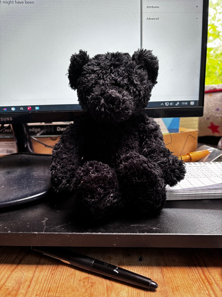 15th July, 2025. Probably along with many other communities, our village puts unused, grown-out-of, unwanted items out onto our driveways or walls for other people to take and a little while ago a small bear appeared on a wall down the road from me, along with a number of other giveaways. I walk past that point every day at least twice and watched as the small collection gradually diminished. I thought the bear would have been first to go, a little cutie with no signs of wear and tear, but no. So, a day or two after everything else had gone, I brought him home, the words of Caroline Ahern as Mrs Merton asking Debbie McGee what first attracted her to millionaire Paul Daniels, morphing in my head to a question about what it might have been about this little black bear that meant people decided to leave him where he was.