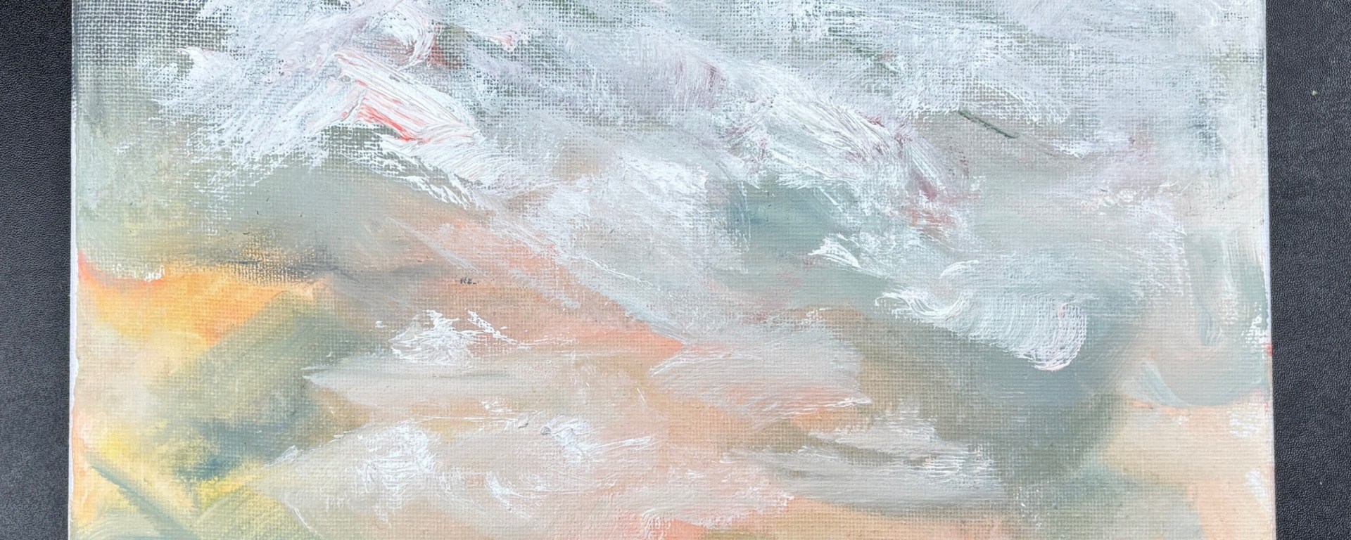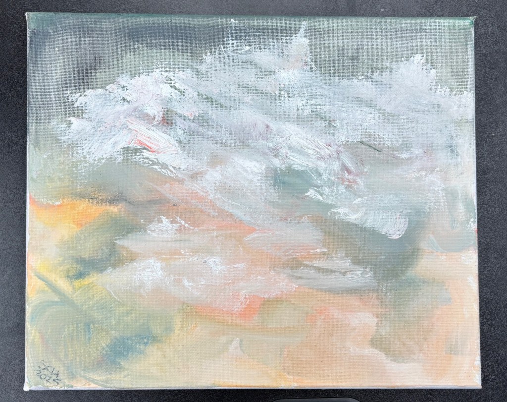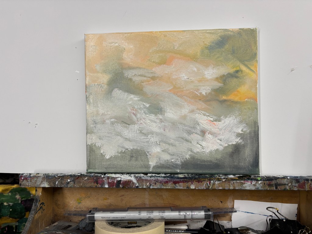 This is dated around October 27th, according to the photo upload date.There are no earlier versions of this because I went straight in and covered the canvas using a photo I’d taken a few years ago of a sky that looked like a swooshed poached egg. This was the first iteration and I didn’t like it. I added a hint of yellow/pink and still didn’t like it.