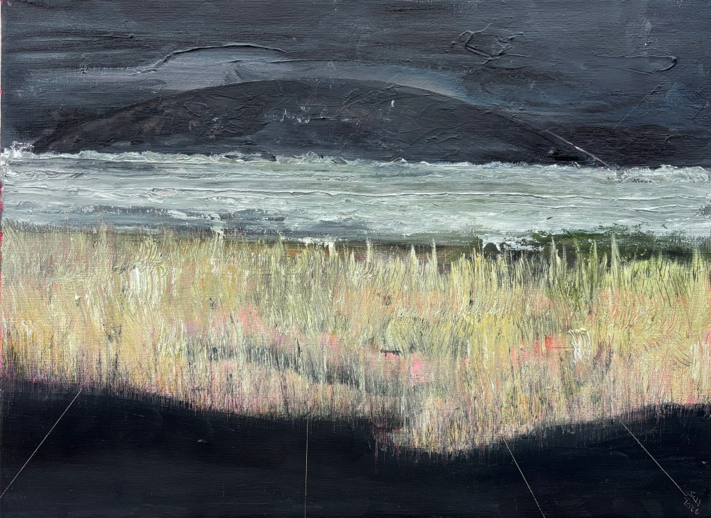 This started life as a relatively tame field scene; then along came the sky, the sea, and the large object in the sky. The camera picks it out, the eye doesn’t – not at first anyway.