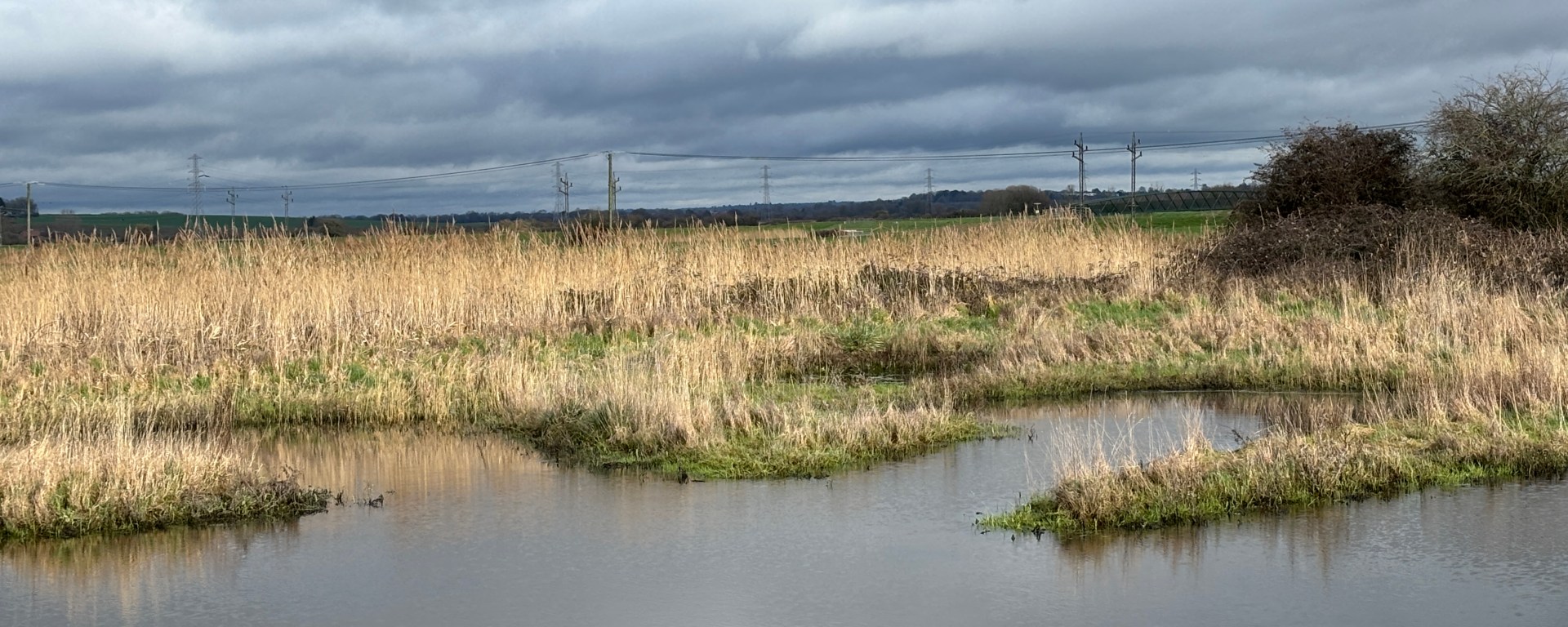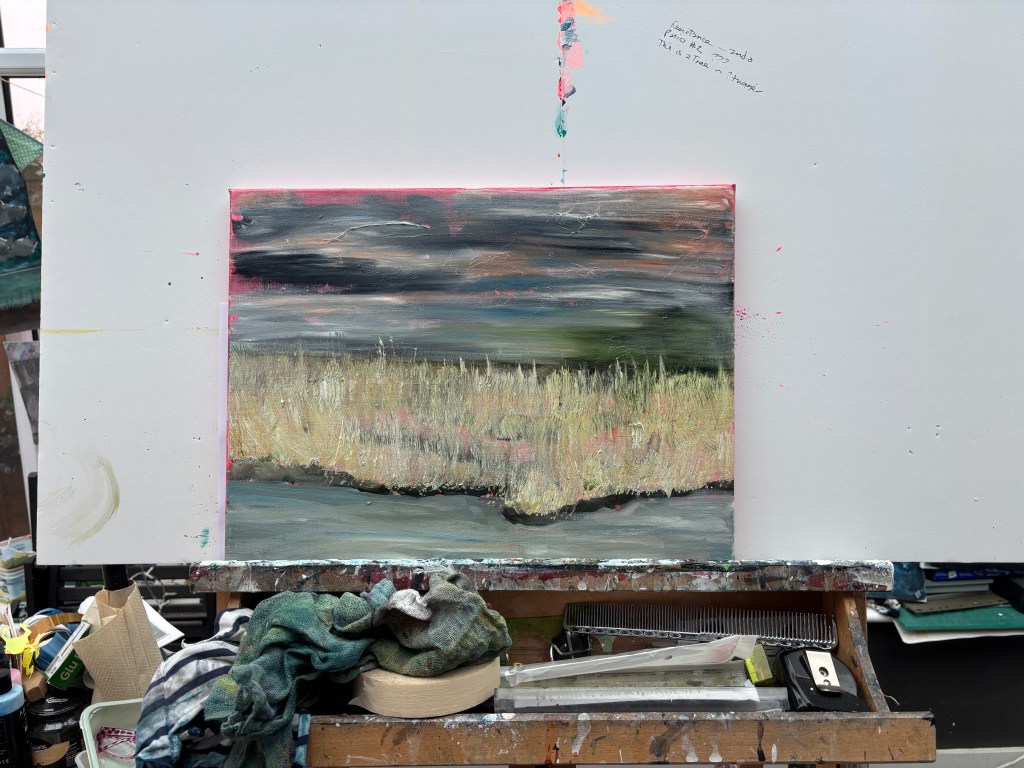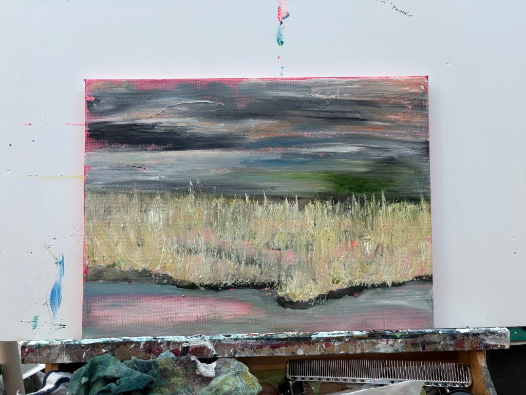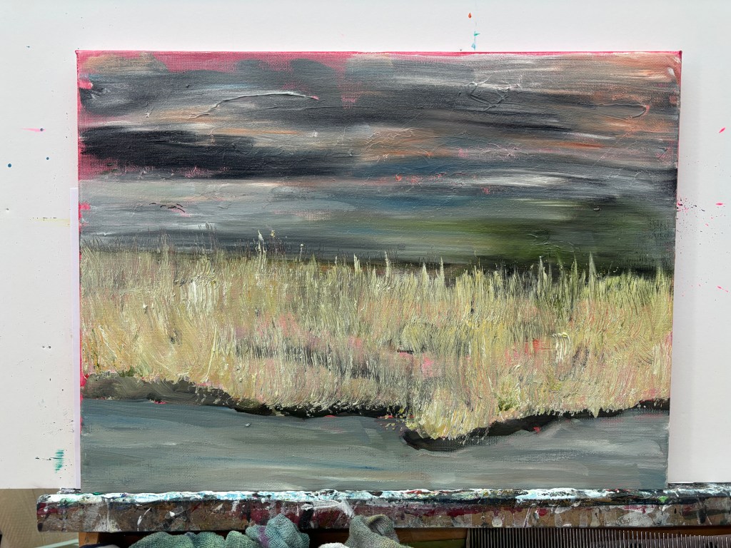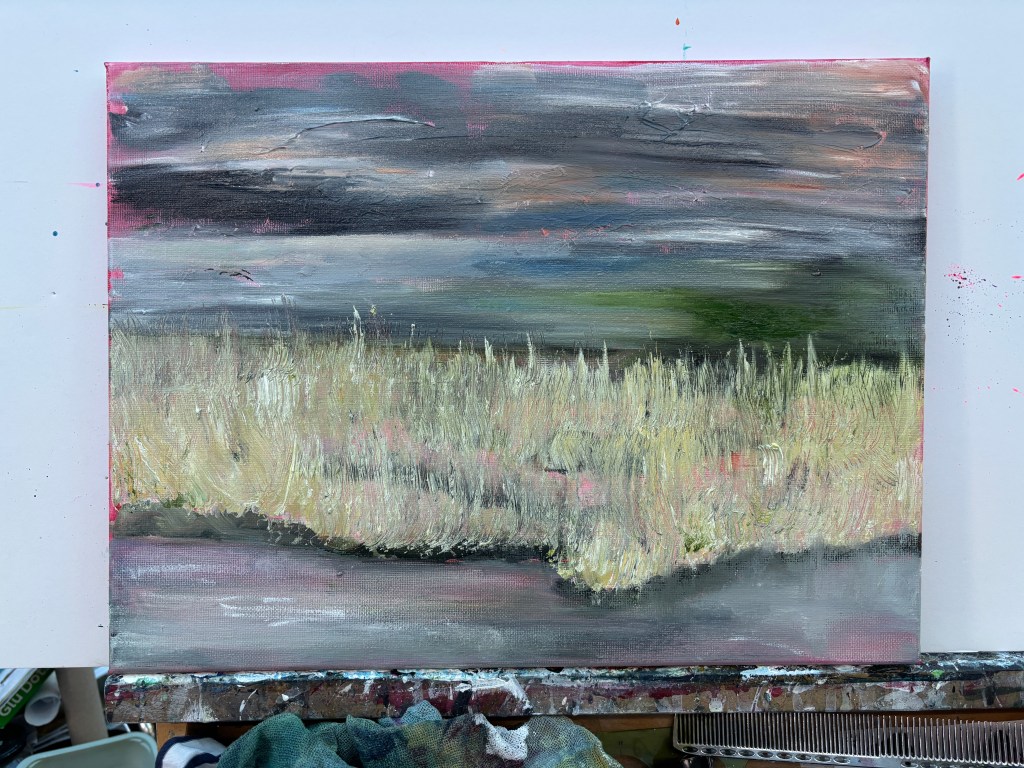 15th February 2026. Water soluble oils on 40x30cm canvas. There’s some extemporising on the reference photo. For instance, close up, the midline of green, which is swept to the left like a speeding car caught on camera, has the horizon in it, just below the first rank of clouds. But at a distance, this looks more like water, almost a sea, stretching from the yellow stands of last year’s reeds into the far distance, and it’s an interesting new perspective. I have birds in or over it at the moment but they can be relocated if necessary. New ideas to think about while it settles.