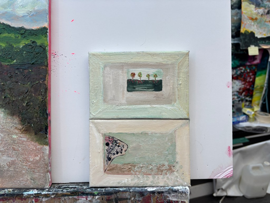 This tiny painting is made up of a background of water-soluble oils, a piece of paper I used to ensure ink flow in a pen, and inking by the pen itself.