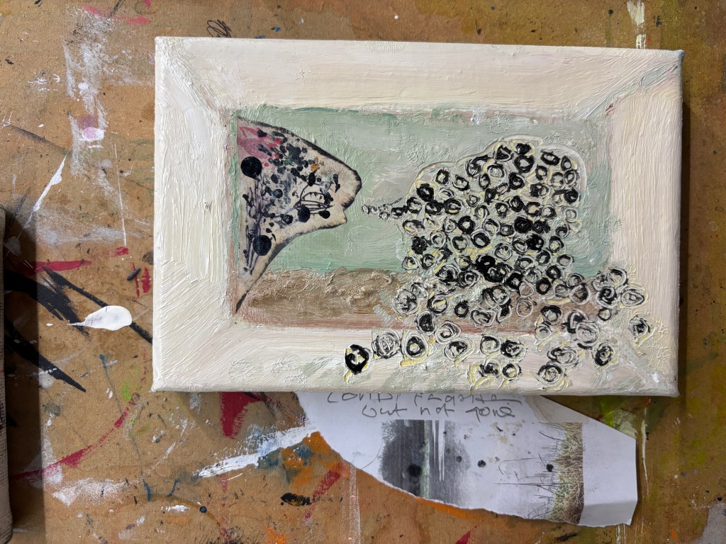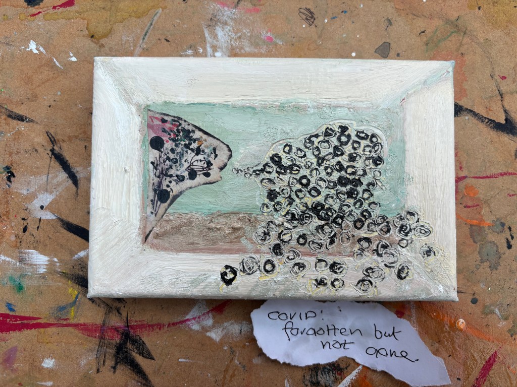 COVID: forgotten but not gone. Water-soluble oils and opportunistic collage on 15x10cm canvas.