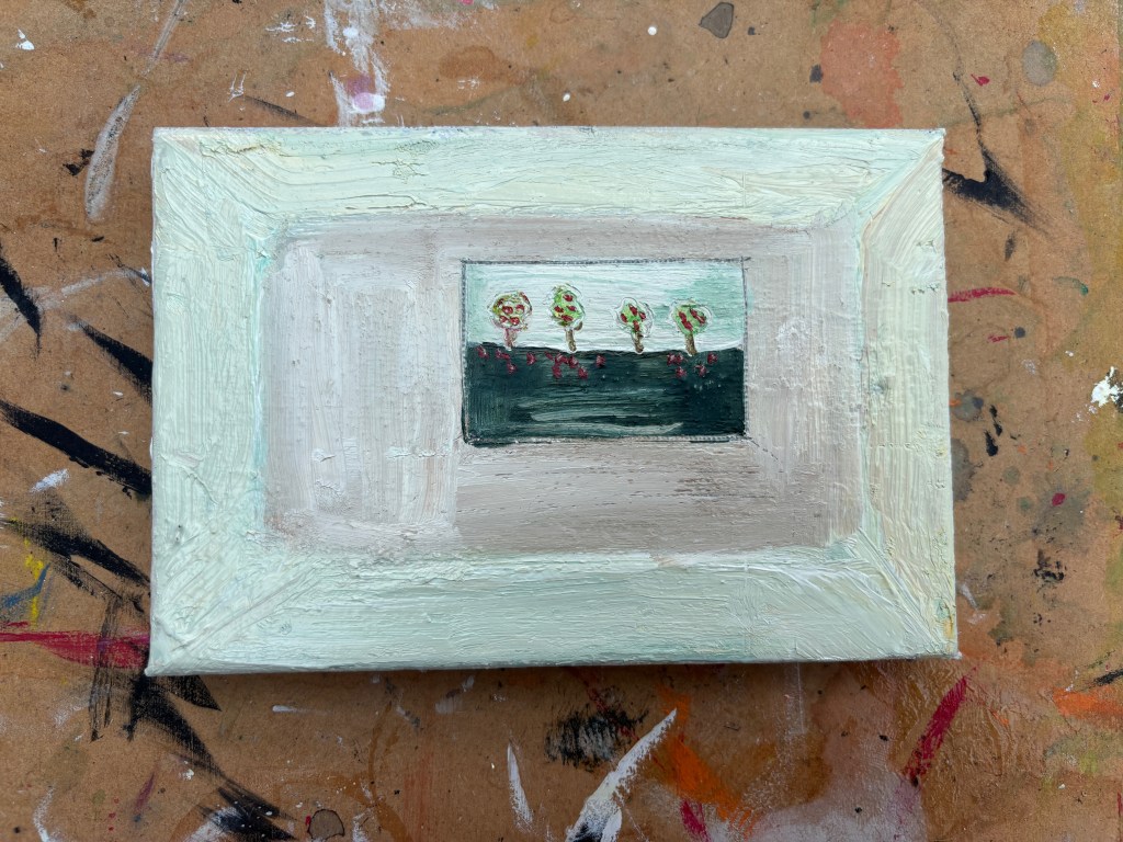 A little light finger-painting here (below) resulting in some more convincing trees but also some unusually large apples.