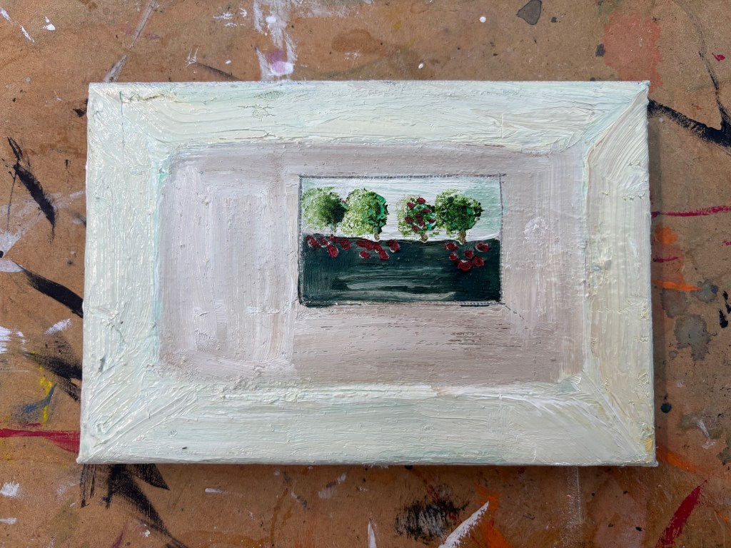 This was a very quick and simple ‘view through a window’ of a row of apple trees, one of which I can see now, has not shed its fruit.