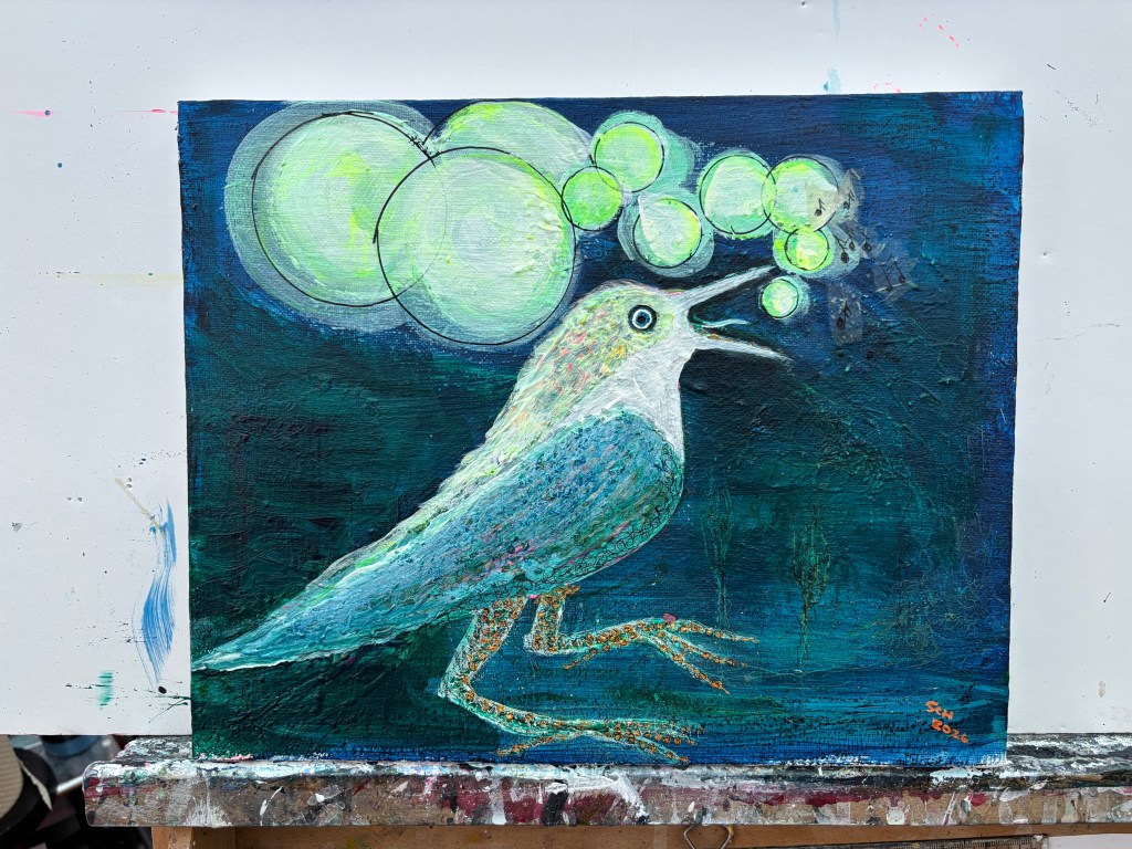 Removed the collaged tissue and repainted the bird’s plumage.