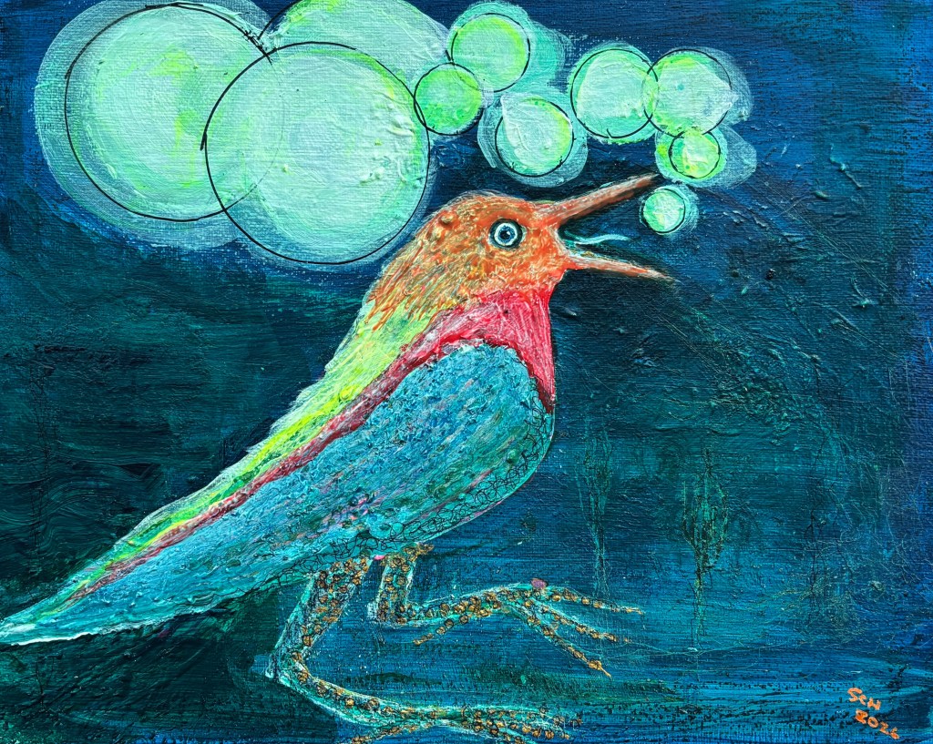 This was very strange, but something much more strange was about to happen. When the universe looked closer, she saw the that the worlds were not making more worlds, instead a completely unknown entity was making them. And it was singing, and with every note, out came a new world, fresh and green and ready for … She stopped, what was the word she was looking for? The world-maker intervened, ‘Bird’ it said, ‘Singer of Worlds’. It fluttered its feathers and hopped onto a twig it had manifested. The universe realised then and there that, while she had not made this creature, she had given it the conditions in which it could exist. Bird sang some more worlds into being and flew away.
