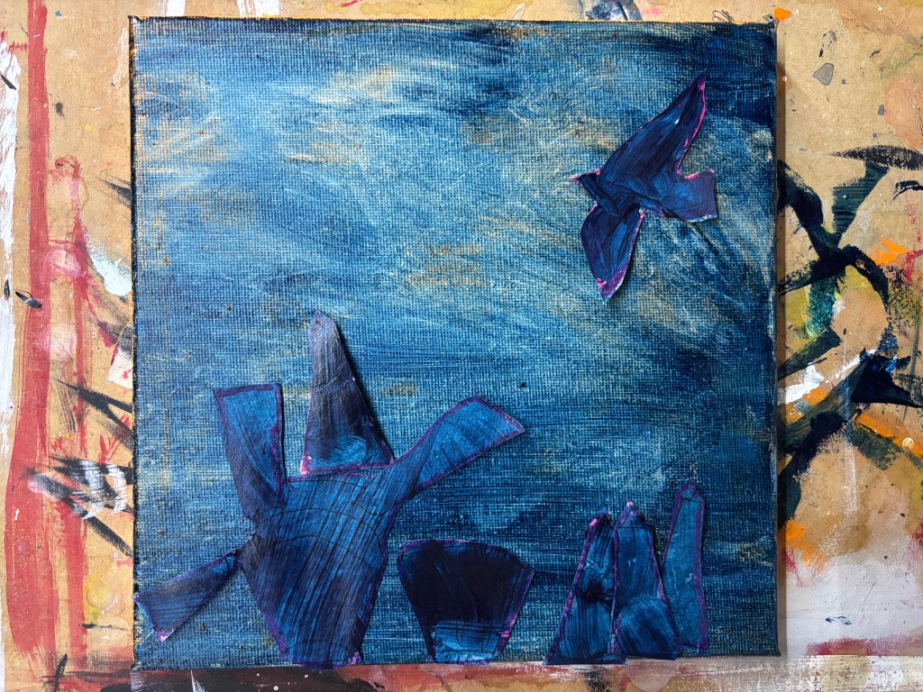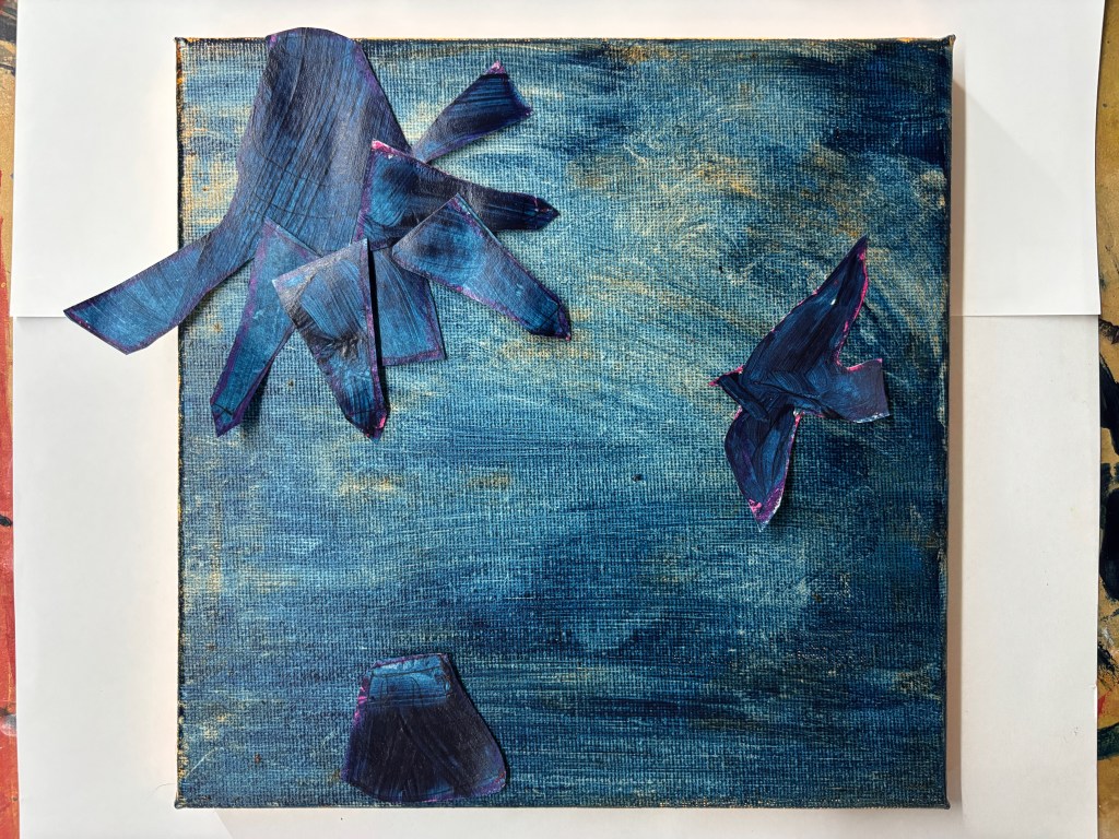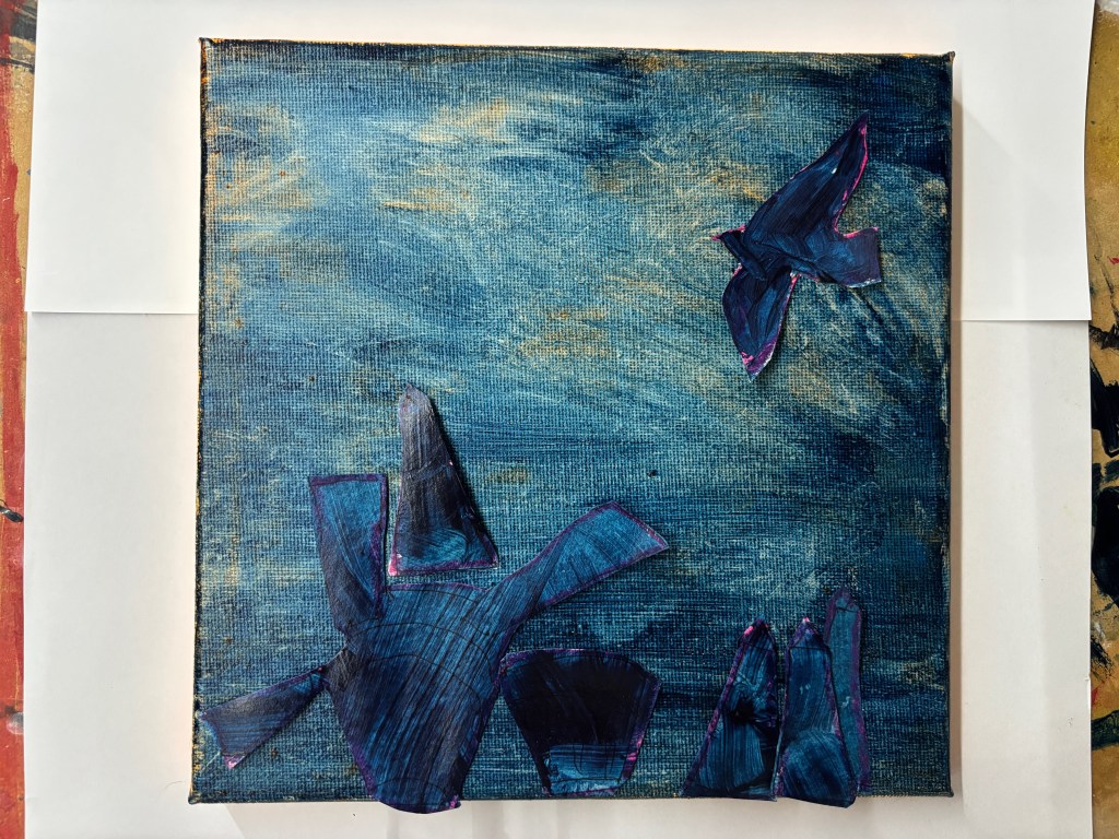“All of humanity”. Christina Koch, Artemis astronaut describing her thoughts when looking at the Earth from the Orion capsule on their return journey from the Moon. April 2026. This painting represents some of the unseen forces – gravity, solar flares, magnetic turbulances, meteorites – that both assist and impede space travel.