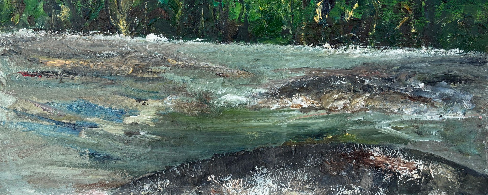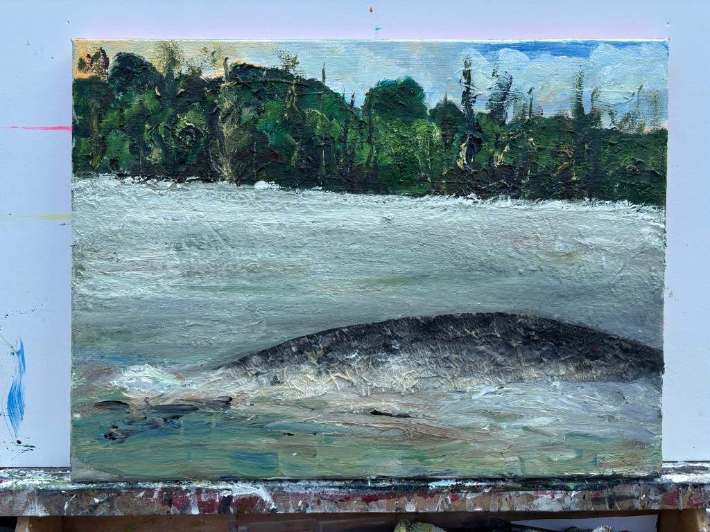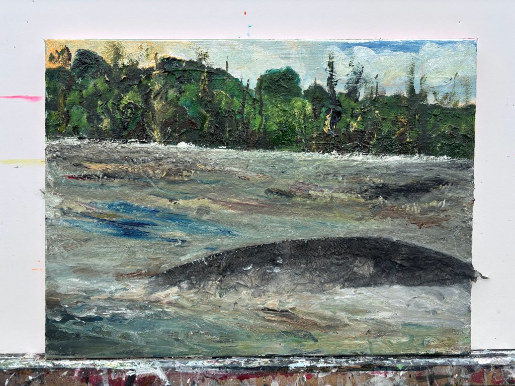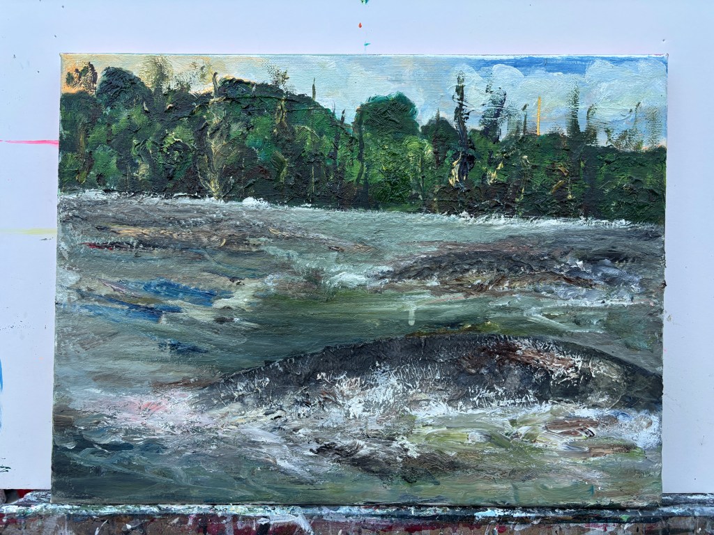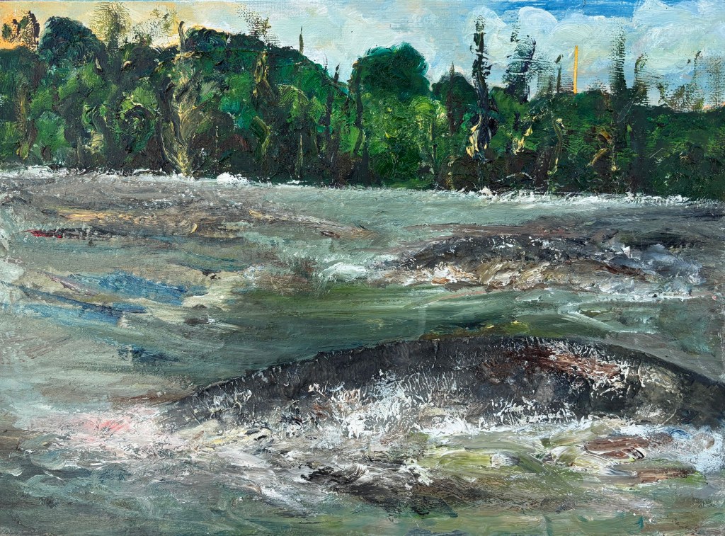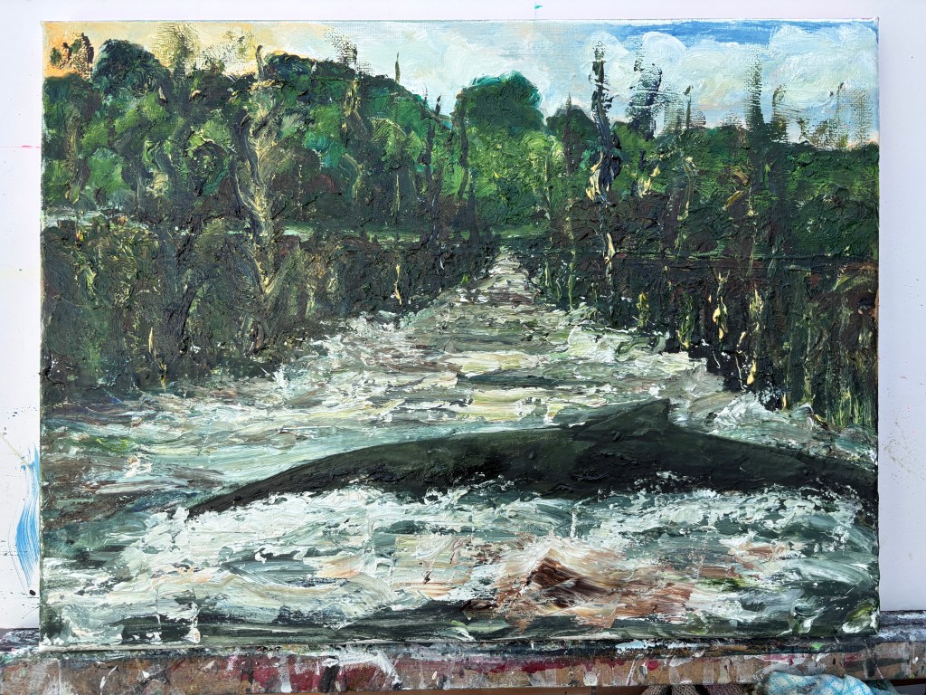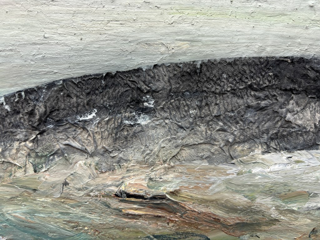 At this point, while there’s still a smidgen of connection to the reality of the setting, this is remote but I was enjoying the wild water and the formidable beast that is either the cause of it or osmething trapped where it had no business being. I’m finding water soluble oils (WSOs) a comfortable medium with its more prolonged malleability over acrylics, even though I have a limited range of colours available to me.