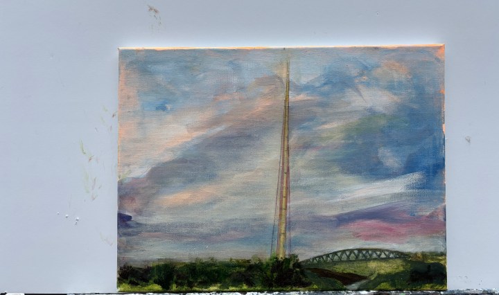 And moved a bridge. From a photograph, this is a not wholly representational image of the day an enormous crane arrived to lift the new bridge into place. I began with a pencil drawing to outline the shapes in their … Continue reading The day that the crane came down